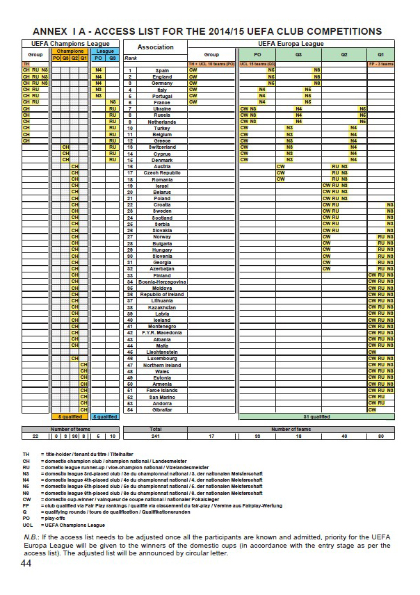 En los últimos tiempos, y debido a los distintos cambios realizados por la UEFA y a que uno de los finalistas de la Copa del rey española esta temporada es -más que previsiblemente- equipo que no va a coger plaza europea en la 15/16 por su clasificación liguera en la 14/15, hay bastante debate sobre qué posibilidades hay y qué equipos jugarán en Europa el año que viene. En este sentido hay que aclarar que el tema es algo complejo y que, en mi opinión, y tras un estudio de las Circulares UEFA, hay algunos supuestos hipotéticos que no están del todo claros que imagino se despejarán cuando UEFA saque las reglas oficiales, estimo, en el mes de abril. Dedicaremos algún artículo más a esta cuestión pero recordando los dos post que nos sirven de base